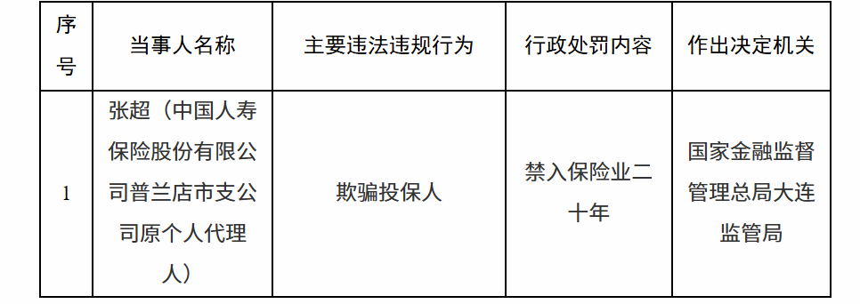 1月22日,国家金融监督管理总局大连监管局行政处罚信息公开表显示,张某(中国人寿保险股份有限公司普兰店市支公司原个人代理人)因欺骗投保人被禁业二十年。